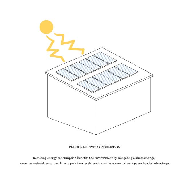 Incorporate the use of renewable energy into the design, such as installing solar panels on the roof to provide electricity, and installing solar water heaters to provide hot water for the interior of the building