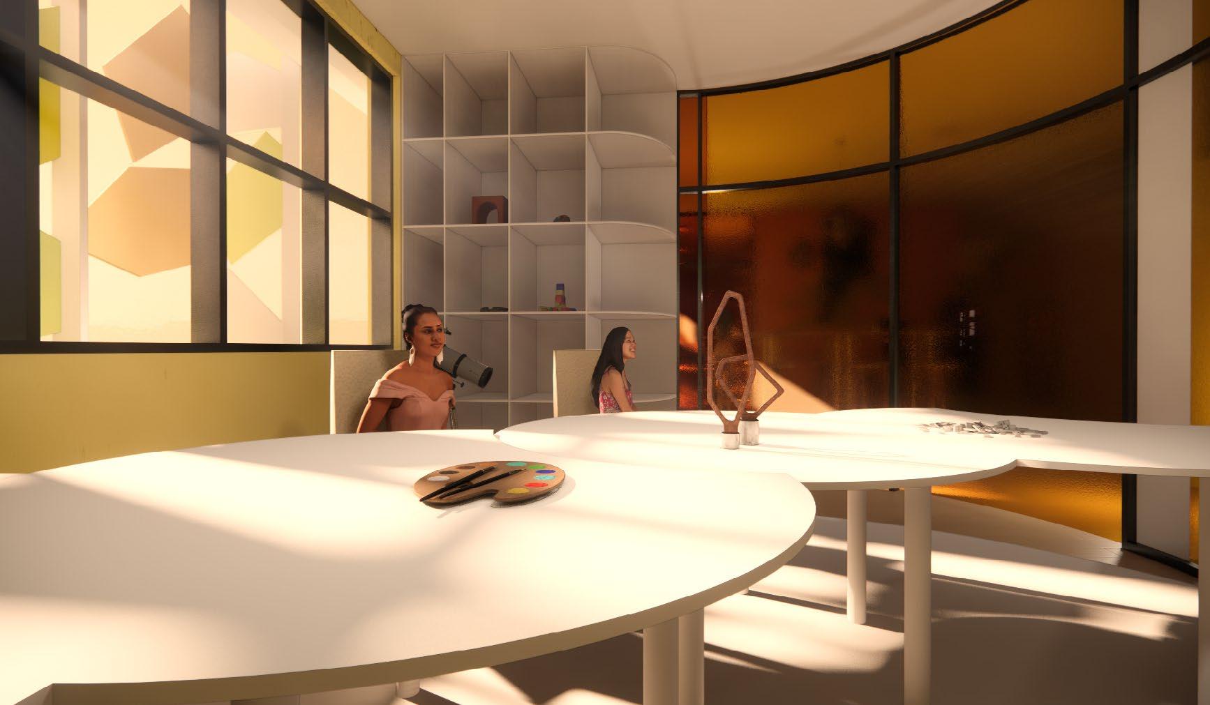 A space that allows multiple collaboration, such as painting, sculpture, photography, etc. There is a storage cabinet where different tools (such as plaster, clay, tripod.) can be stored.