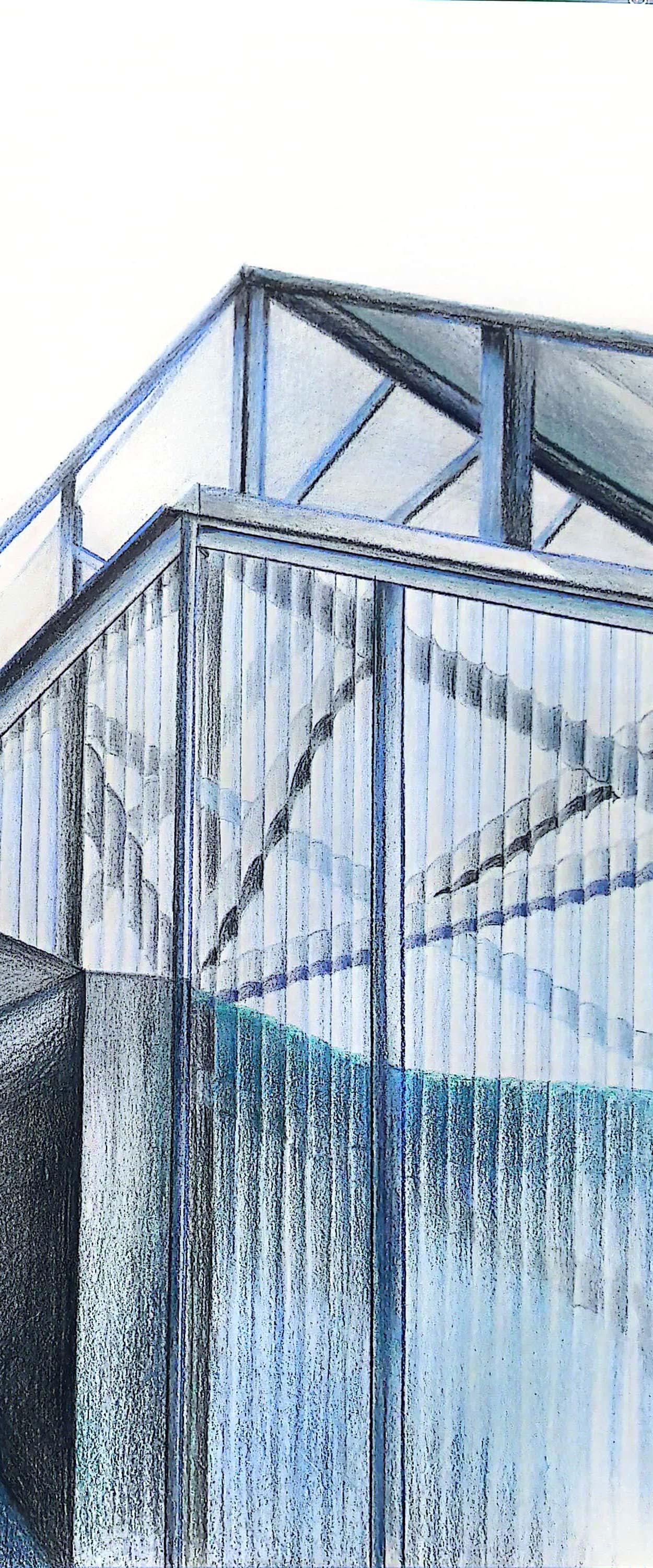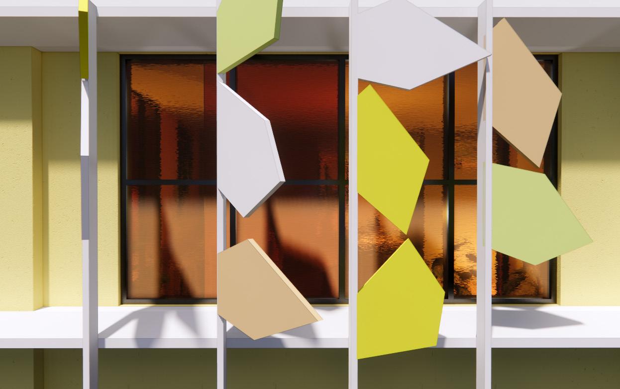 Shading panels get asthetic effect to inside. Its main function is to avoide straight sunlight and as a shelter to decrease the weather damage. Additionally, panels can be controlled by users.