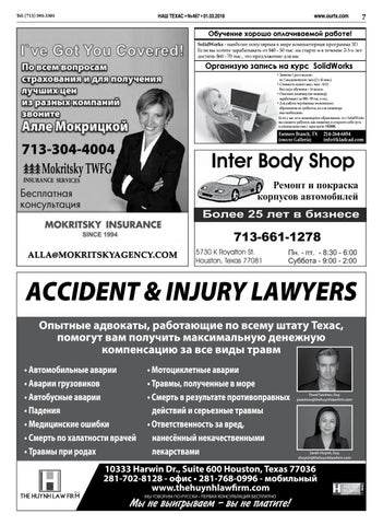 ACCIDENT & INJURY LAWYERS Опытные адвокаты, работающие по всему штату Техас, помогут вам получить максимальную денежную компенсацию за все виды травм • Автомобильные аварии • Аварии грузовиков • Автобусные аварии • Падения • Медицинские ошибки • Смерть по халатности врачей • Травмы при родах
