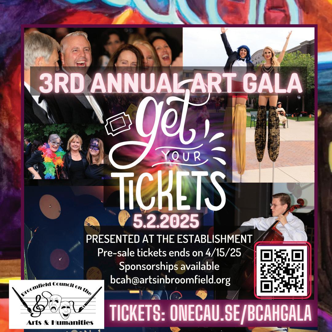 May 2: Join us for the 3rd Annual Art Gala: Elevate Creativity on Friday, May 2, at 6:00 p.m. at The Establishment in Bradburn. The Broomfield Council on the Arts & Humanities (BCAH) invites you to an unforgettable evening of spectacular indoor/outdoor performances, a silent auction, and the highly anticipated Creative Immersion Room, "Elevate Yourself Creatively." Enjoy a wow factor evening while supporting BCAH's mission to make creative experiences accessible to all. As this is Broomfield’s own Met Gala, the dress code is creative black tie. This vital fundraiser supports BCAH's diverse programs, benefiting 35,000 annually. Don't miss this chance to elevate creativity in Broomfield! For ticket information, visit www. artsinbroomfield.org.