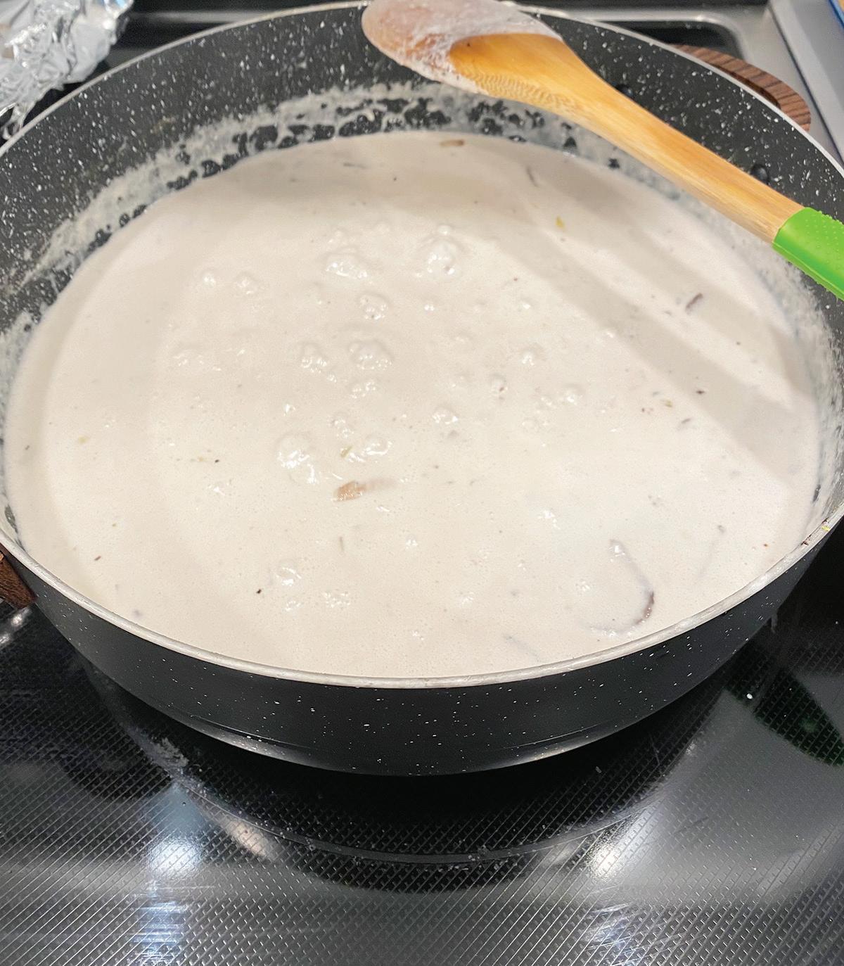 4. Add the garlic and flour and cook, whisking constantly, until fragrant but not burned, about 1 minute. Add the garlic salt, salt, and pepper and slowly pour in the cream. Cook,