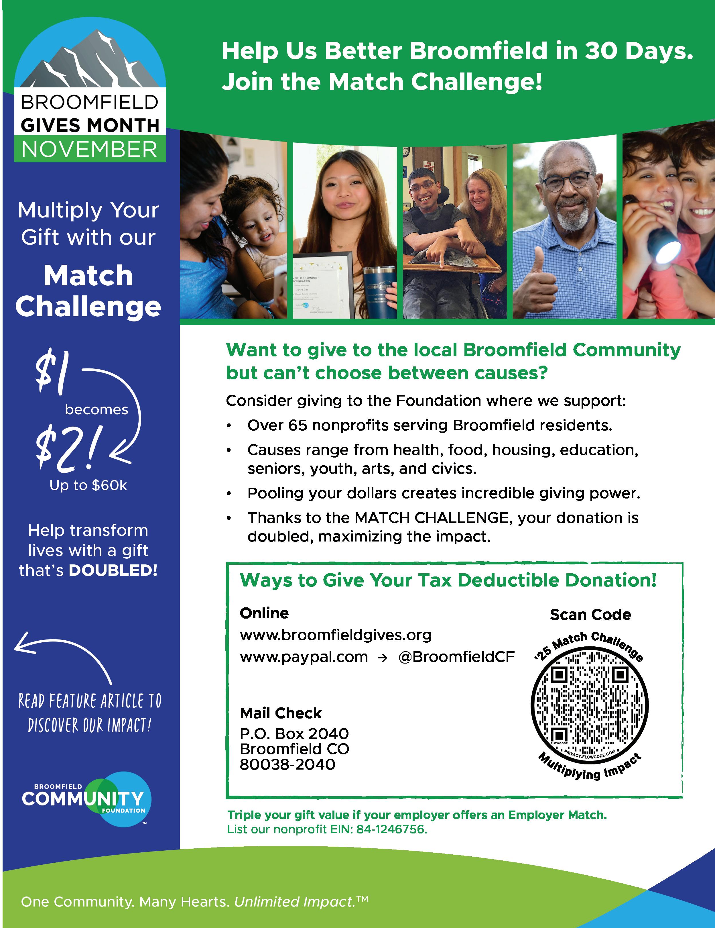 Broomfield is filled with organizations and people who strive each day to make the world a better place. But the groups are many and the needs are great. Individual support is absolutely needed and impactful, but in a crowded landscape, the Broomfield Community Foundation serves as a multiplier and distribution engine for Broomfield’s many community non-profits.