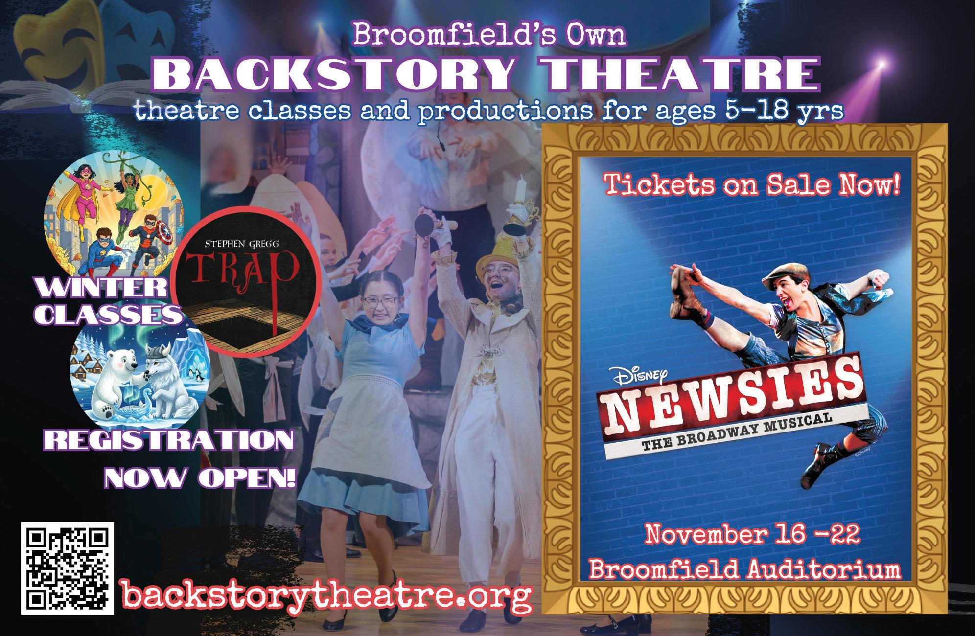 Backstory Theater proudly presents the Tony Award-winning musical phenomenon, Newsies, at the Broomfield Auditorium on November 16, 20, 21, and 22. Inspired by a true story, Newsies is set in turn-of-the-century New York City and follows charismatic newsboy Jack Kelly as he rallies his fellow teenaged "newsies" to strike against publishing titans Joseph Pulitzer and William Randolph Hearst for fair wages. The show runs approximately 2 hours and 30 minutes. Tickets are $22.50 for adults and $17.30 for children under 12 and seniors. Buy tickets online at www. backstorytheatre.org.
