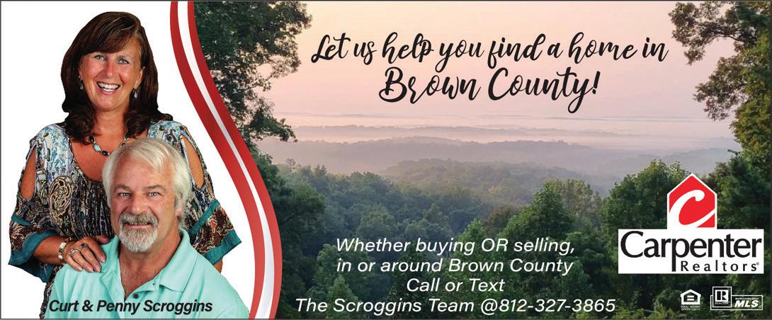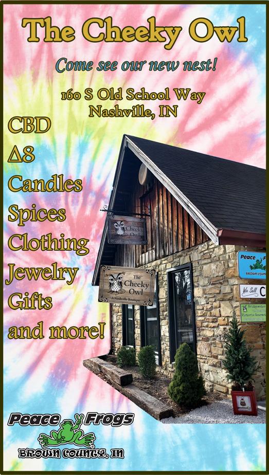 March/April 2023 • Our Brown County 51 5730 N State Rd 135 • Bean Blossom • 812-720-3743 Brownie’s Featuring some of your old favorites and some tasty new ones Daily Specials • Breakfast till 2:00 Dine In or Carr y Out 7 am to 8 pm • closed Thursdays Owners Paul and Tania Lattimore Selling gently used items to bene t Brown County. Accepting clothing and household item donations. Women’s boutique, kids and teen clothing, men’s clothing, and household items Tuesdays and Thursdays 10:00 to 5:00 Fridays 10:00 to 3:00 South Van Buren in Nashville (near stoplight, behind Subway) (812) 988-6003 Look for the signs Like us on Facebook at Brown County Community Closet, New Pizza & Wings, Groceries, Ice Large Selection Domestic/Craft Beer & Wine LOTTERY, Tobacco Products Camping Supplies, Live Bait & Tackle Hunting & Fishing Licenses Check Station, Firewood State Road 45 and Helmsburg Road Intersec tion • (812) 929-7797 Owners: Sharon & Leonard Richey Helmsburg GENERAL STORE Authentic Mexican Cuisine A 812-988-4535 Carr y Out Available COACHLIGHT SQUARE 101 E. Washington St. one block east of S. Van Buren St. (in front of the high school) in downtown Nashville •Daily Specials •Kid’s Menu Family Owned and Operated FULL BAR AVAILABLE