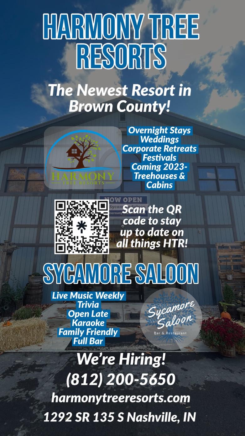 March/April 2023 • Our Brown County 57 245 N. Je erson St. | 812-988-8400 |800-848-6274 www.hotelnashville.com 194 N. Van Buren St. | 812-988-6429 www.nor thhousegetaway.com BRICKLODGEN HOORTHHOUSE TELNASHVILLE 1878 N. State Rd. 135 | 812-988-6429 www.bricklodge.com Suites, Studios, Restaurant & Bar Hot Tubs, Indoor Pool, Whirlpool Weddings & Receptions, Special Getaway Packages Accommodates 8 Guests, 2 Bedrooms & 2 Baths Game Room w/Pool Table, Cable TV, DVD Player Full Equipped Kitchen, Central Heat & Air Gas Fireplace, Outdoor Hot Tub, Gas Grill Accommodates 8 Guests, 3 Bedrooms & 2 1/2 Baths Cable TV, DVD Player, Fully Equipped Kitchen Central Heat & Air, Elec tric Fireplace Secluded Hot Tub, Gas Grill BrownCountyGetaways Indiana’s Oldest Toy Store (812) 988-2817 • www.BrownCountyToyChest.com All the best in games, puzzles, dolls, crafts, science kits, and more. 125 S. Van Buren St • Nashville, IN (in the Artists Colony Shops Complex) $5 at rate shipping on $50+ orders Play for All Ages • 10,000+ items in the store