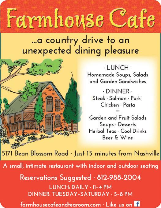 March/April 2023 • Our Brown County 55 State Roads 46 & 135 270 S. Van Buren St. in Nashville Nashville BP 812-988-1822 Fresh In-Store Donuts Broasted Chicken www.blitzbuilders.com 800-628-1324 “ Where Q uality is A ordable” Family owned for over 30 yea rs! WE DO IT ALL! Custom Horse Barns • Garages • Homes • Workshops Commercial Buildings • Metal Roo ng Your Post Frame Specialists Discount Code: Quality ally sourced & handcrafted Personal Care Products made from natural ingredients 145 S. Van Buren Street Nashville, IN Pamper Yourself with Mother Nature’s Gifts Ethica A female veteran owned company suppor ting other female and veteran suppliers 812-720-7018 • RedheadApothecar y.com Redhead Apothecar y Naturally balanced with natural products ...a country drive to an unexpected dining pleasure 5171 Bean Blossom Road • Just 10 minutes from Nashville A small, intimate restaurant with indoor and outdoor seating LUNCH Wednesday – Sunday 11 – 3 farmhousecafeandtearoom.com Like us Homemade Soups Garden and Fruit Salads Sandwiches Desserts LUNCH Herbal Teas • Cool Drinks Beer & Wine