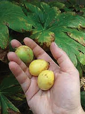 My collection of wild foraging texts, now admittedly old and dated, all agree that while the stem, root, and leaves of mayapple are poisonous, the fruit is edible when ripe and bright yellow. Years ago—anxious to try our luck with wild foods—several of us young Euell Gibbons disciples found a patch to sample. In his book, Stalking the Wild Asparagus, Gibbons cautioned that the mayapple, also called raccoon berry, hog apple, and wild lemon, possesses a poisonous chemical called podophyllin. It acts on the liver, in what is described as cathartic (cleansing), emetic (causing vomiting), and anthelmintic (acting to expel or destroy parasitic intestinal worms). This warning made us pay close attention in our search. The fruits we found were still a pale yellow. Our enthusiasm waned and we wondered if the chemical found in the plant could migrate to the fruit?