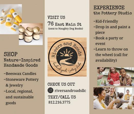 May/June 2023 • Our Brown County 13 38 Franklin St. E. | Nashville, IN | drink atthecreek.com | Open Ever y Day BONE APPETIT BAKERY PPETIT BAKE For Dogs Get a FREE Sampler bag of natural dog treats with $10 purchase and this ad. www.barkingood.com • Premium, all-natural treats since 1997 • Over 20 varieties from low-fat to grain-free • Gourmet and seasonal snacks, too DOGS WELCOME! (812) 988-0305 211 S. Van Buren St. (behind Visitor Center) Open 7 days SUBSCRIBE One Year ’s Subscription for $20 (six issues) Mail with check or money order to: Our Brown County P.O. Box 157 • Helmsburg, IN 47435 Name: Address: N SUBSCRIBE! Makes a great gift. The Totem Post 78 S. Van Buren St. Nashville , IN 812-988-2511 ~Since 1952~ TheTotemPost.com • Genuine Native American Jewelry • Zuni Fetishes • Sterling Silver Jewelry • Copper Jewelry • Minnetonka Moccasins • Pendleton • Knives ~Open all year~ Unplug with a Good Book Journals • Sketchbooks Handmade Greeting Cards Local Postcards 45 S. Je erson St. • Nashville, IN 812.988.0202 • fallenleafbooks.com Open 7 days a week 10 am to 5 pm Old, New, Used and Rare Books created by hand local artisans EST1978 BROWN COUNTY Fine arts and crafts by local and area artists View their work on Facebook & Instagram See something you want? Message us! Open Daily 10 to 5 812.988.7058 62 E. Washington · Nashville, IN · BrownCountyCraftGallery.com