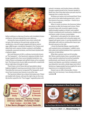May/June 2023 • Our Brown County 65 5730 N State Rd 135 • Bean Blossom • 812-720-3743 Brownie’s Featuring some of your old favorites and some tasty new ones Daily Specials • Breakfast till 2:00 Dine In or Carr y Out 7 am to 8 pm • closed Thursdays Owners Paul and Tania Lattimore Selling gently used items to bene t Brown County. Accepting clothing and household item donations. Women’s boutique, kids and teen clothing, men’s clothing, and household items Tuesdays and Thursdays 10:00 to 5:00 Fridays 10:00 to 3:00 South Van Buren in Nashville (near stoplight, behind Subway) (812) 988-6003 Look for the signs Like us on Facebook at Brown County Community Closet, New Pizza & Wings, Groceries, Ice Large Selection Domestic/Craft Beer & Wine Tobacco Products Camping Supplies, Live Bait & Tackle Hunting & Fishing Licenses Check Station, Firewood State Road 45 and Helmsburg Road Intersec tion • (812) 929-7797 Owners: Sharon & Leonard Richey Helmsburg GENERAL STORE Authentic Mexican Cuisine A 812-988-4535 Carr y Out Available COACHLIGHT SQUARE 101 E. Washington St. one block east of S. Van Buren St. (in front of the high school) in downtown Nashville •Daily Specials •Kid’s Menu Family Owned and Operated FULL BAR AVAILABLE