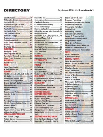 July/August 2018 • Our Brown County 9 Brown Co Inn.................................49 Cornerstone Inn............................66 Creekside Retreat.........................55 eXplore Brown County..................4 Green Valley Lodge......................23 Hidden Valley Inn.........................22 Hills o’ Brown Vacation Rentals..14 Hotel Nashville..............................71 Brown Co KOA Campground......46 Monroe Music Park & Campground.................................68 Moondance Vacation Homes.....51 The North House...........................71 Overlook Lodge............................62 Rawhide Ranch.............................29 Salt Creek Inn................................23 Seasons...........................................37