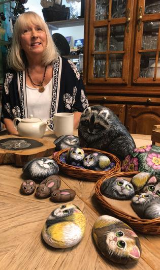 She paints big-eyed animals on smooth Brown County rocks and sells them at Common Grounds Coffee Bar in Nashville, with all proceeds going to support the humane society.