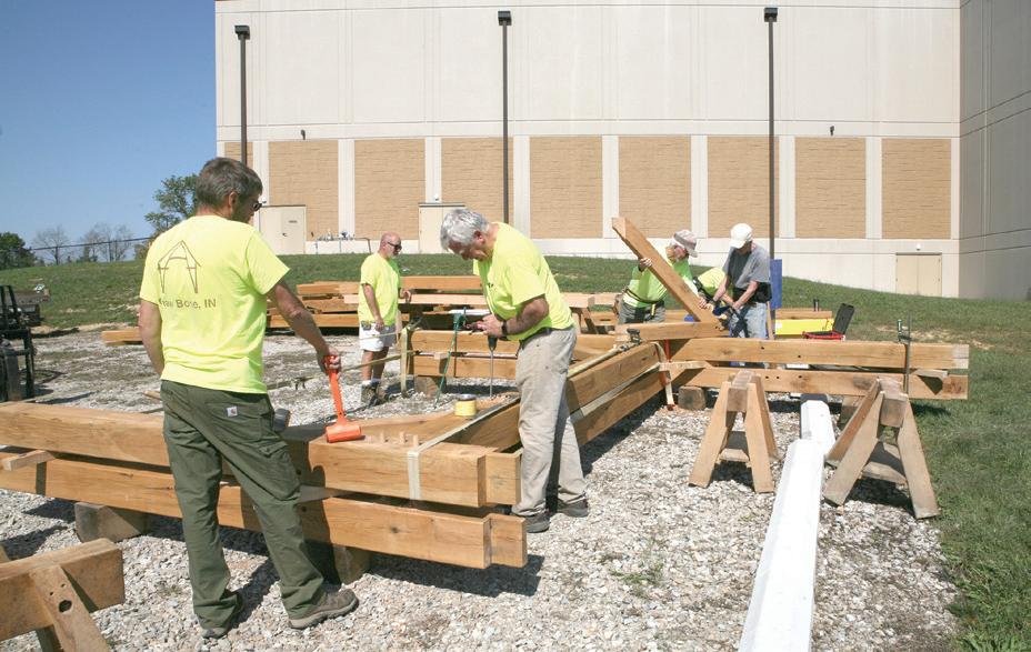 The timber framing group built and donated a shelter at the Grandview Cemetery. In 2022, the group constructed, donated, and auctioned a 16-by-24-foot “cruck” structure that yielded $45,000 for Brown County Indiana Habitat for Humanity.
