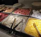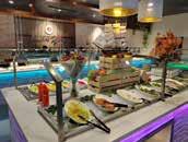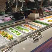 In the evenings, the cold bar includes fancier offerings like snow crab legs, oysters, peel and eat shrimp, and even more sushi options.