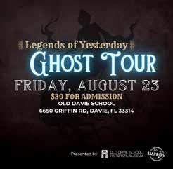 Head to the Old Davie School and enjoy this spirited stroll through Davie uncovering its historical and supernatural hotspots along the way! Hosted by ConspiriSisters from This Is Improv. Tour starts at 6:30 pm at the Old Davie School, 6650 Griffin Road. For more info, call 954-797-1044. Scan the QR code for more info.