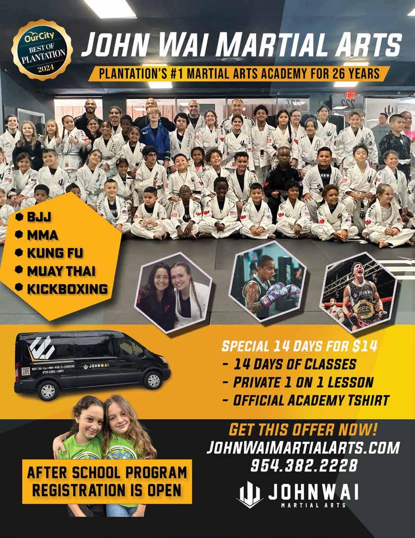 John Wai, a Plantation resident, Brazilian Jiu Jitsu Black Belt, and Professional Fight Coach, has operated John Wai Martial Arts in Plantation for 27 years. Visit johnwaimartialarts.com.