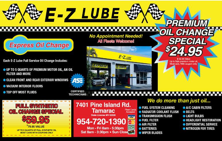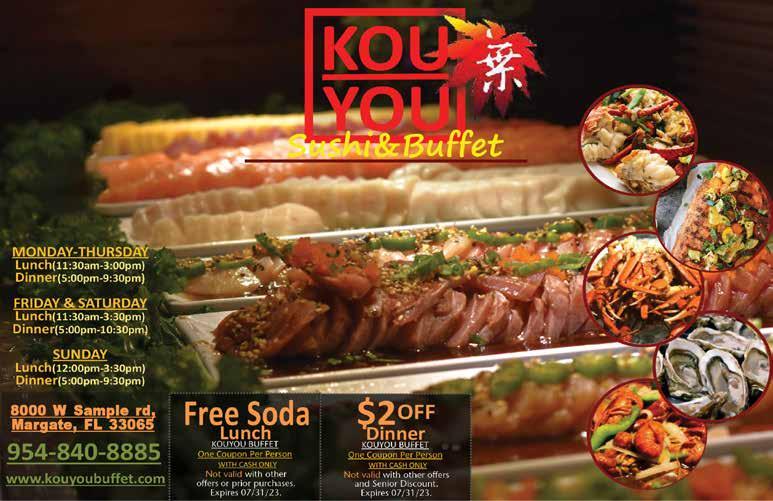 6400 N. University Drive Tamarac, FL 33321 954-722-1144 OpenMon.-Sat.6AM-2PM,Sun.7AM-1 PM CASH ONLY OMELETTE SUPREME With Home Fries $9.95 TURKEY/ ROAST BEEF With h Fries $9.95 BACON CHEESE BURGER With Egg & Fries $11.95 GRILL • MELTS • HOT PLATTERS • HOMEMADE CHILI • SALADS Breakfast & Lunch Specials Every Day DINE-IN • TAKE OUT OMELETTES • PANCAKES • FRENCH TOAST • EGGS BENEDICT EGGS BENEDICT WITH HOME FRIES 2 EGGS ANY WAY Ham,BaconorSausage, HomeFries,or Grits &Toast FRENCH TOAST Strawberry & Blueberry $9.95 DAILY SOUP & SANDWICH SPECIALS We are family owned & operated for over 45 years! Enjoy our Daily Omelette Special! $6.95 $9.95 MELT Traditional • Old Fashio Men’s & Boys Hair Styling Since 1995 Appointments Suggested 2692 N. University Dr. Sunrise, FL 33322 • S cissor Cuts • L ayer Cuts • R azor Cuts • Flat Tops • Fades • Hot Shaves • B eard Trim • L adies Cuts OPPORTUNITIES For Rent: Barber Chair, Manicure/Pedicure Chair Now Hiring: Barber/Stylist with or without following. 32 / Our City Tamarac / June-July 2023 / OurCityMedia.com