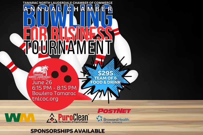 The Tamarac North Lauderdale Chamber of Commerce is hosting a fundraising event on Wednesday, June 26th from 6:00pm to 8:15pm at Bowlero Tamarac, located at 8501 N. University Dr, Tamarac, FL 33321. The event is a Bowling4Business tournament brought to you by Puroclean “The paramedics of property damage” WM “Reuse, recycle, and reduce the waste for a better future” Postnet Lauderhill “Big or Small, We Print It All,” Broward Health Coral Springs “The Power of One Gift” designed to bring businesses together for a fun and productive networking experience, while also supporting the Chamber’s mission to benefit local schools and small business projects.