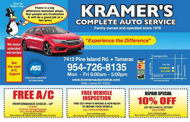 ■ PUBLISHER’S PAGE Call Today for an Appointment! 954-663-7170 www.HandyChris.net FREE RESIDENTIAL ESTIMATES! HANDLES INSURANCE CLAIMS 10% OFF WITH THIS COUPON May not be combined with any other offers. 6/30/24. ✔ Plumbing Repair ✔ Bathroom Remodeling ✔ Kitchen Remodeling ✔ Framing ✔ Carpentry ✔ Fence Repair ✔ Roof Repair ✔ Electrical ✔ Flooring ✔ Wall Repair ✔ Painting ✔ Fascia ✔ Honey-Do Lists ...and more! Licensed & Insured #14-FC-18309-X Total Handyman Services: HireaHandyman! WHY PAY MORE? Christopher Courter HANDYMAN EXTRAORDINAIRE 2024 BEST OF PLANTATION