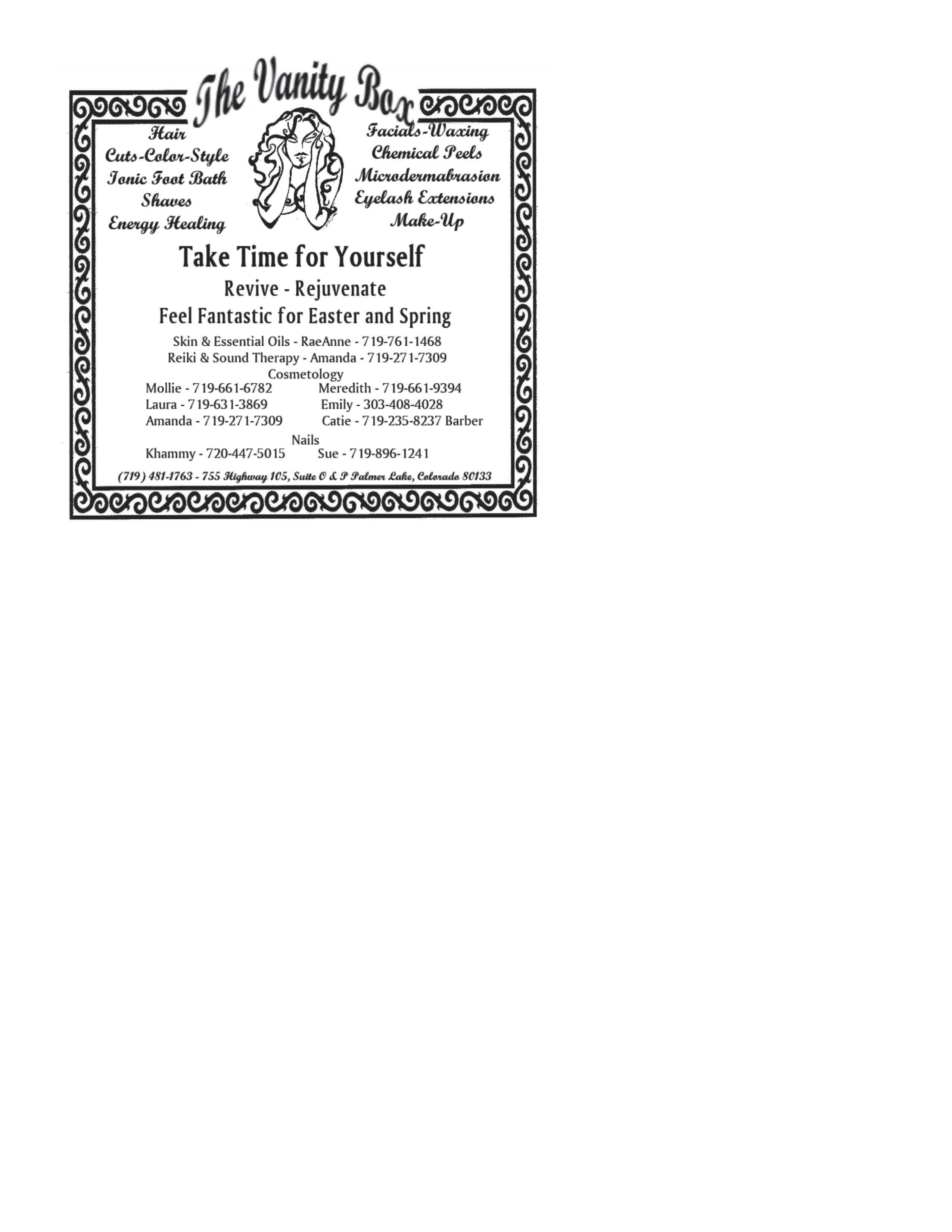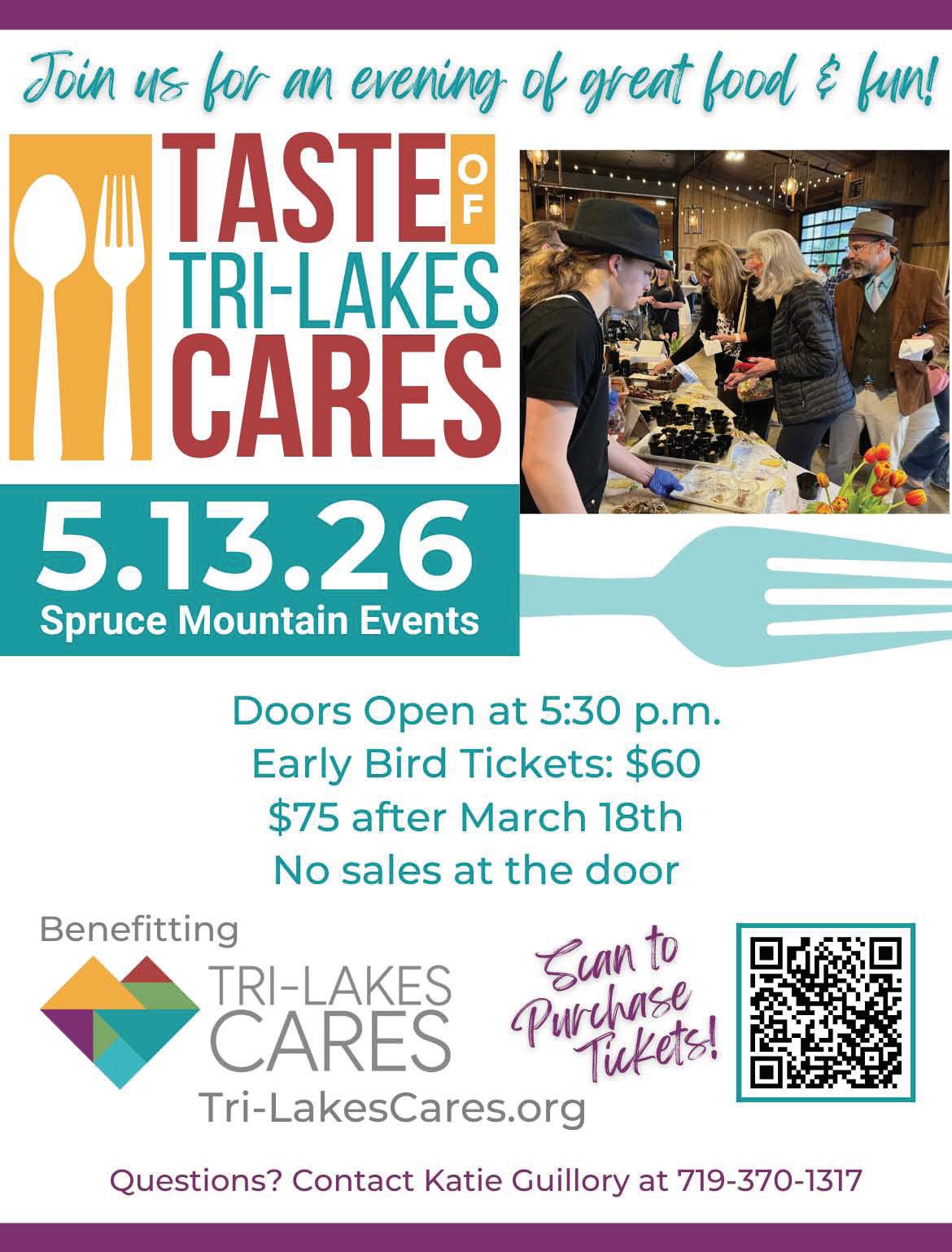 • Taste of Tri-Lakes Cares, Wed., May 13, 5:30 pm-10 pm. Spruce Mountain Events. Doors open at 5:30 pm. Join us for an evening of great food and fun! Early Bird Tickets $60. $75 after March18. No sales at the door. Benefitting Tri-Lakes Cares. Info: Katie Guillory, 719-370-1317. https:// tri-lakescares.org. See ad on page 11.