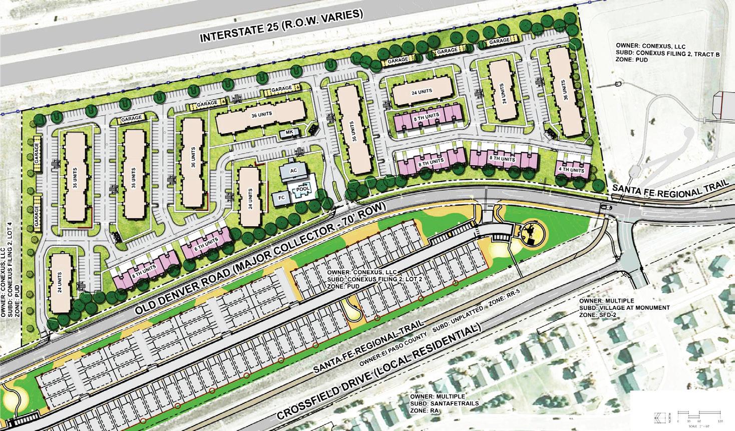 Conexus Lot One is part of a large, proposed mixed-use development located in the 80132 area on the west side of I-25, situated between Old Denver Road and Interstate 25 and east of the Buffalo Valley Path area in Monument. The project features a 23-acre, 158-unit residential subdivision along that strip of land. Nearby areas are planned for commercial/ industrial use.