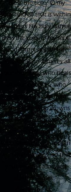 “Bless the LORD, O my soul; and all that is within me, bless His holy name! Bless the LORD, O my soul, and forget not all His benefits: Who forgives all your iniquities, who heals all your diseases, who redeems your life from destruction, who crowns you with lovingkindness and tender mercies, who satisfies your mouth with good things, so that your youth is renewed like the eagle’s.” Psalm 103:1-5