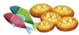 Jesus’ disciples didn’t think the boy’s lunch would help thousands of hungry people. But Jesus performed a miracle. First He told the people to sit down. Then He thanked God for the food and began to hand it out. He turned a small lunch into a huge dinner for all those people! There were even leftovers for the disciples.