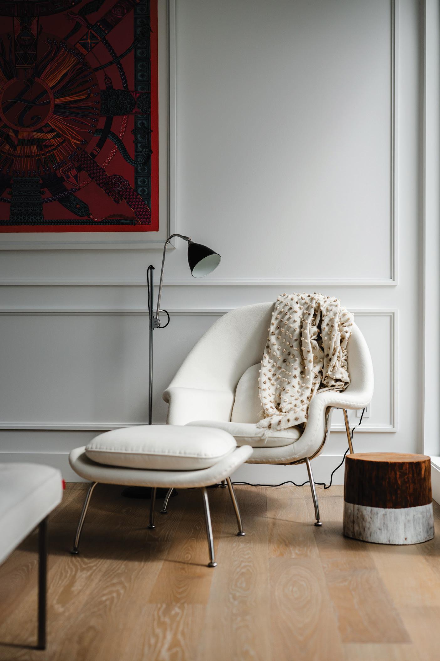 A combination of natural and artificial light offers ambience, day or evening. Sheers can be installed to filter the sun’s intensity during peak periods, while layering with heavier drapery adds a layer of cosiness during autumn and winter. Incorporating an adjustable reading lamp is essential, and a dimmer would be ideal. Select a bulb with a temperature between 2700K to 3000K for a warm, welcoming glow (cooler light feels more clinical).