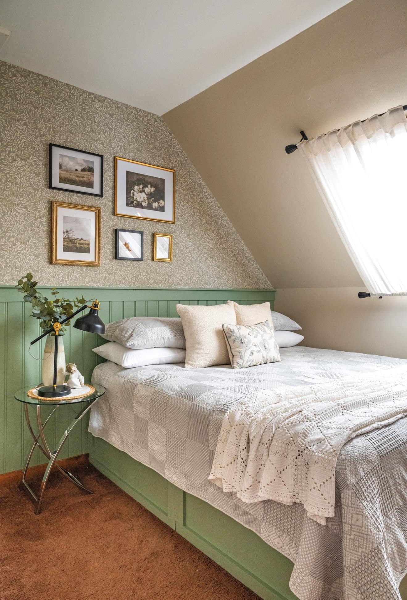 Integrate a side table or solid surface to set your coffee or tea, a favourite candle and your current read. When selecting paint, warm hues and deep colours can create an enveloping feeling. Green tones are an excellent option as their connection to nature is appealing to many.