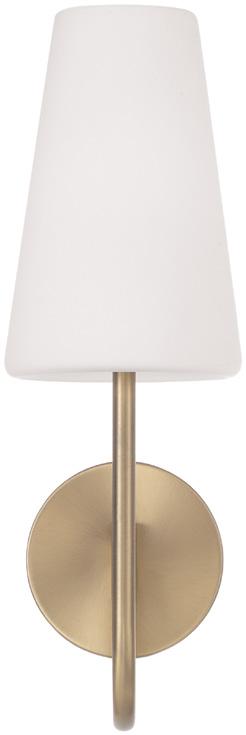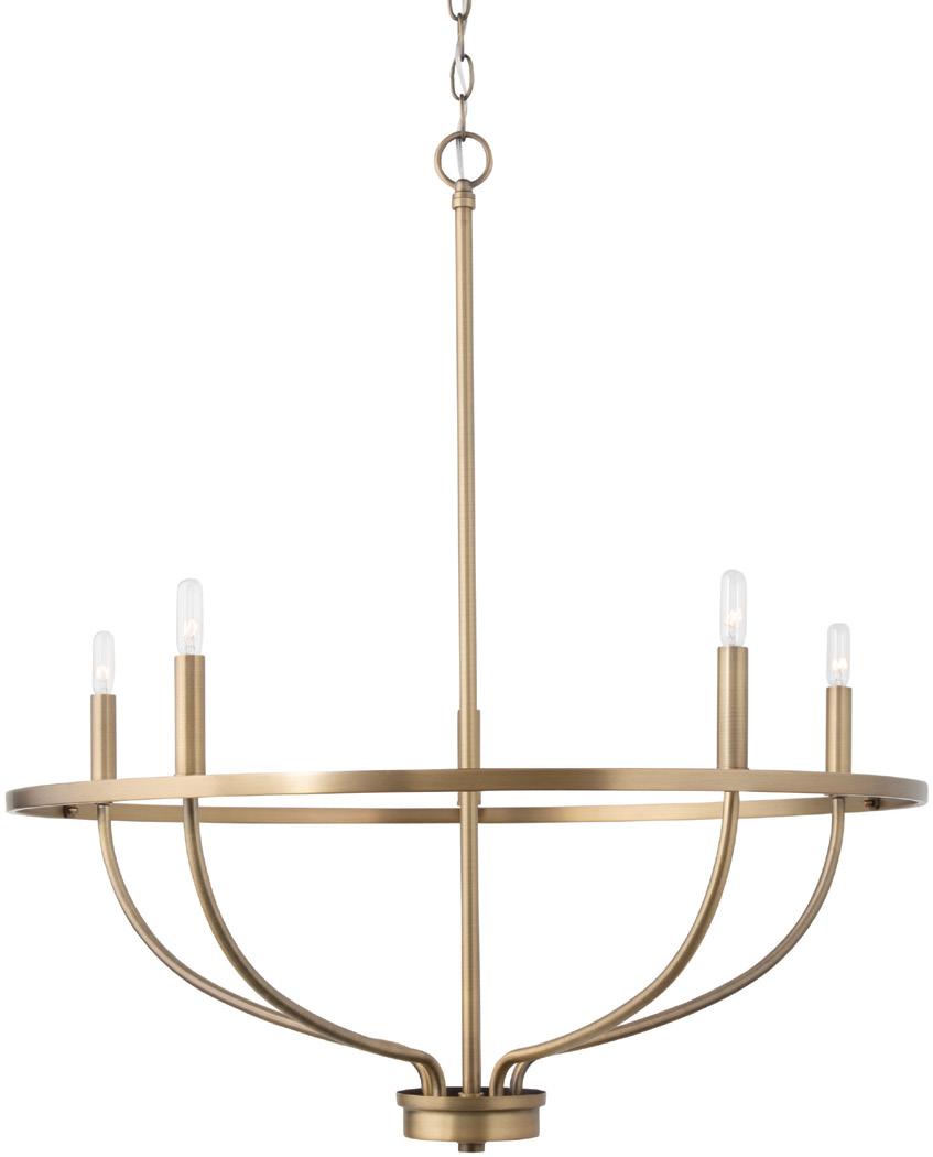 The Greyson chandelier adds a classic silhouette over a vessel bathtub with its graceful curves and multiple finish choices. The Averitt sconce, in an agedbrass finish, pairs with the chandelier, offering visual warmth over a vanity.