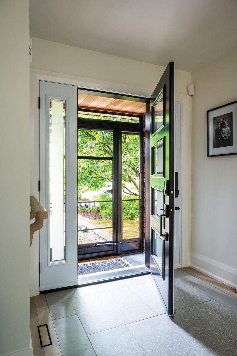 The front entranceway also underwent an overhaul. A larger door with a glass side panel that opens replaced the original door and static side panel. A ghost screen on the porch door easily rolls out of view when not used and cedar lines the porch ceiling.