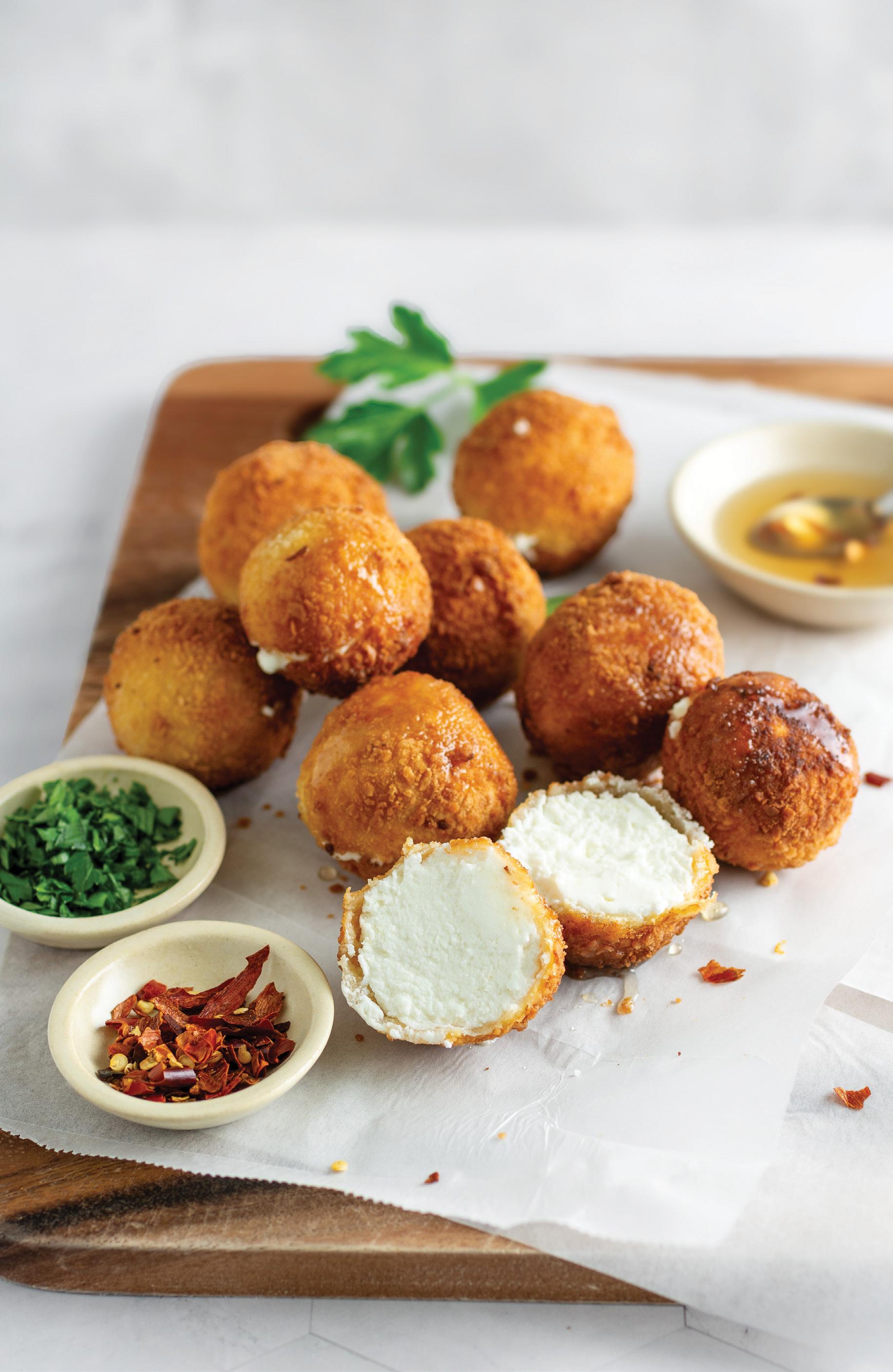 CRISP ON THE OUTSIDE, CREAMY ON THE INSIDE, THESE FRIED GOAT CHEESE BALLS ARE PERFECT FOR FALL GATHERINGS. SERVE WITH A DRIZZLE OF SPICY HERBED HONEY.