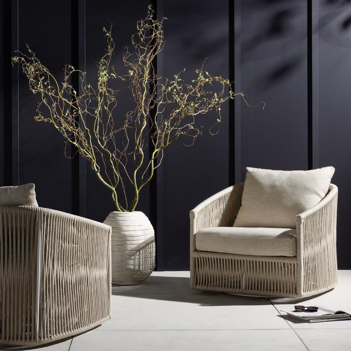 16. JAIPUR LIVING: Skandi SKA03 Indoor/Outdoor Pouf 17. CB2: Faro Handwoven Performance White and Natural Indoor/Outdoor Area Rug 18. CB2: Silves Light Brown Boucle Outdoor Throw Pillow 20x12 19. ANNIE SELKE: Zhara Stripe Ivory Indoor/ Outdoor Decorative Pillow 20. CRATE & BARREL: Monstera Jacquard 20x20 Loggia Tan Outdoor Throw Pillow OH