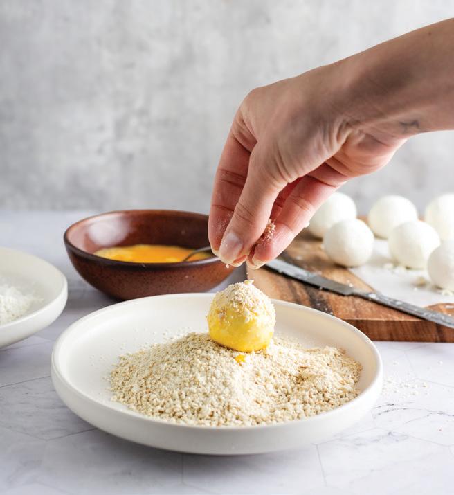 CRISP ON THE OUTSIDE, CREAMY ON THE INSIDE, THESE FRIED GOAT CHEESE BALLS ARE PERFECT FOR FALL GATHERINGS. SERVE WITH A DRIZZLE OF SPICY HERBED HONEY.