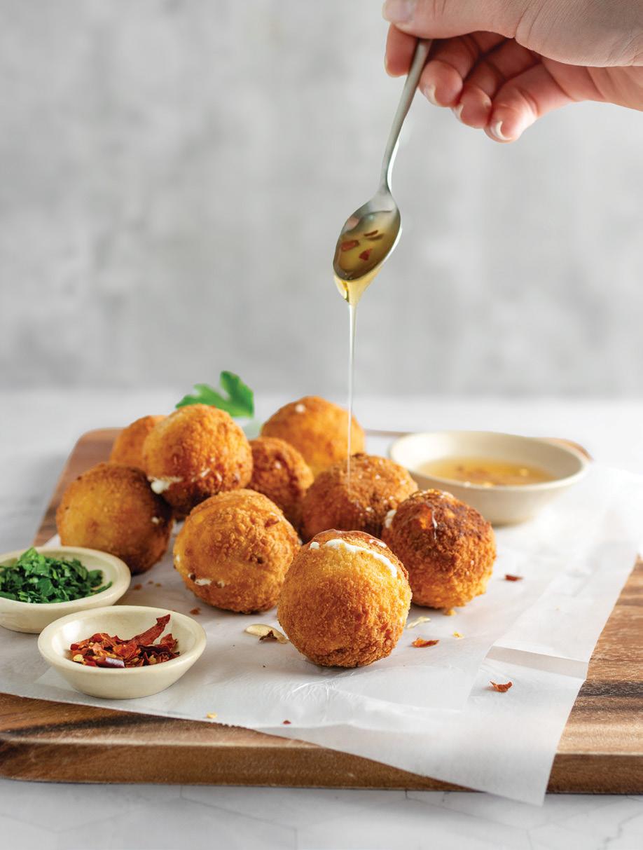 CRISP ON THE OUTSIDE, CREAMY ON THE INSIDE, THESE FRIED GOAT CHEESE BALLS ARE PERFECT FOR FALL GATHERINGS. SERVE WITH A DRIZZLE OF SPICY HERBED HONEY.