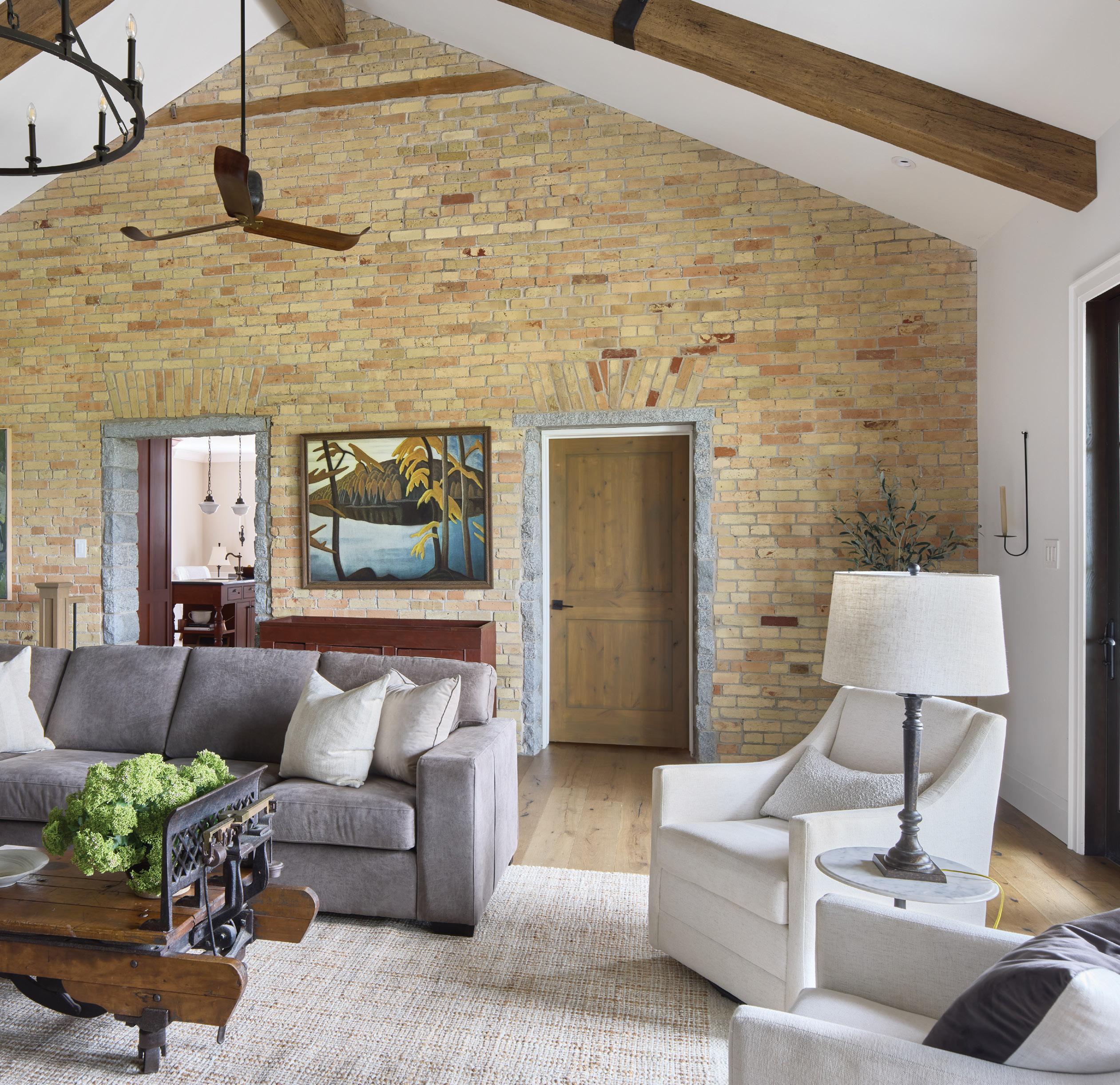 ABOVE LEFT: The kitchen’s traditional custom cherry cabinetry, farmhouse sink and copper accents provide warmth and a nod to the past. LEFT: A casual dining space flows off the kitchen with gorgeous views of the property. FAR LEFT: The new relocated entrance to the home has Doric pillars, simple decorative scrollwork and a classic black lantern that complements the black front door. ABOVE RIGHT: A wall of exposed yellow brick from the original farmhouse provides depth and character to the great room. A handsome staircase from London Stair & Railing Co. Ltd. provides access to the downstairs. An ivory natural wool/jute area rug defines the living space.