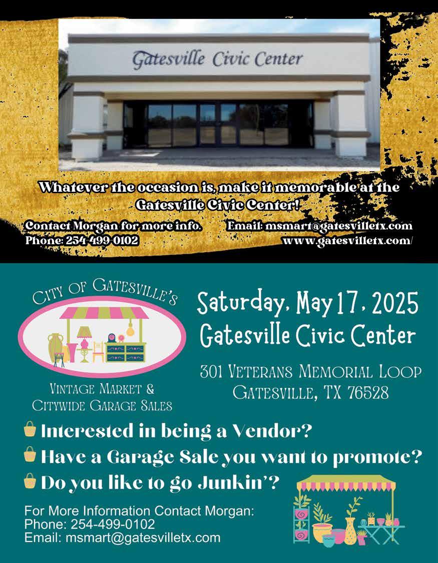 March 22 - Copperas Cove Spring Fest at 1206 W Ave. B, 2-7PM. Join the City of Copperas Cove Parks and Recreation for our Annual Spring Fest! Come out and celebrate the season with a fun-filled day for the whole family. This event will have: Food Trucks serving delicious bites, Beer and Wine Vendors from local breweries and wineries, Pop-Up Markets featuring local vendors, Live Entertainment to keep the vibe going, Activities for the Kids to enjoy, and Adult Softball Tournament for some friendly competition. This event is FREE to attend, with $5 parking. Don’t miss out on the fun—mark your calendars, grab your friends and family, and let’s welcome spring together!
