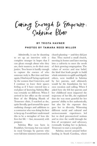church planting — and they did just that. They started a small church, meeting in homes and later moving into a cafeteria to meet the needs of their growing congregation. The values of service and true belief, the kind that leads people to build whole ministries to uplift and dignify others, were instilled in Sabrina by her parents, and ultimately would be the foundation for her own vocation and calling. When I asked how she felt her parents and her childhood most impacted the trajectory of her life, she explained that she was most grateful for her parents’ ability to live authentically, but also for the exposure they gave her to diversity. Witnessing different racial and cultural and socio-economic experiences led her to shed preconceived notions and to view the world through the lens of acceptance and advocacy, eventually leading her to Jackson, Tennessee to start a non-profit. Sabrina moved around before landing in South Carolina, where