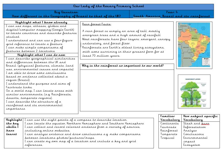 can describe the structure of a rain forest and its environmental importance. can formulate questions to research about the physical or human geography of Brazil / UK.