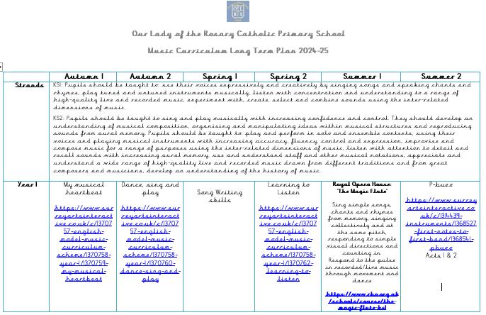 Music is a universal language that allows the pupils of Our Lady of the Rosary to expressthemselves as composers, performers, improvisers, and communicators. Rooted in our Catholic faith, we aim to inspire a love of music that develops a range of skills through exploring the interrelated dimensions, whilst also nurturing a deeper understanding of God's creation and the beauty of His gifts.