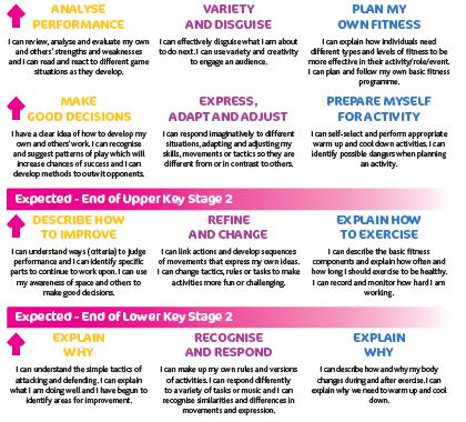 In all classes, there are children of differing physical ability. Whilst recognising this fact, we provide suitable learning opportunities for all children by matching the challenge of the task to the ability of the child. We achieve this through a range of strategies: setting common tasks that are open-ended and can have a variety of results, setting tasks of increasing difficulty, where not all children complete all tasks, grouping children by ability and setting different tasks for each group, providing a range of challenge through the provision of different resources. A PE lesson will finish with a cool down activity and a reflection on what has been learnt.