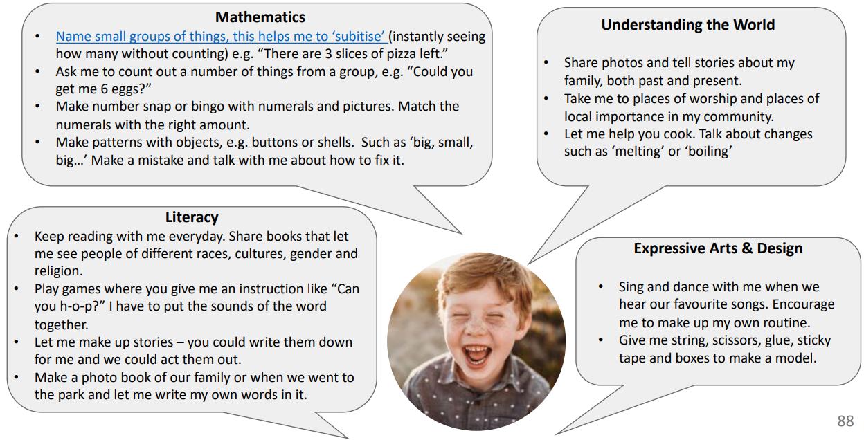 The Early Years Foundation Stage(EYFS) sets standards for the learning, development and care of your child from birth to 5 years old.