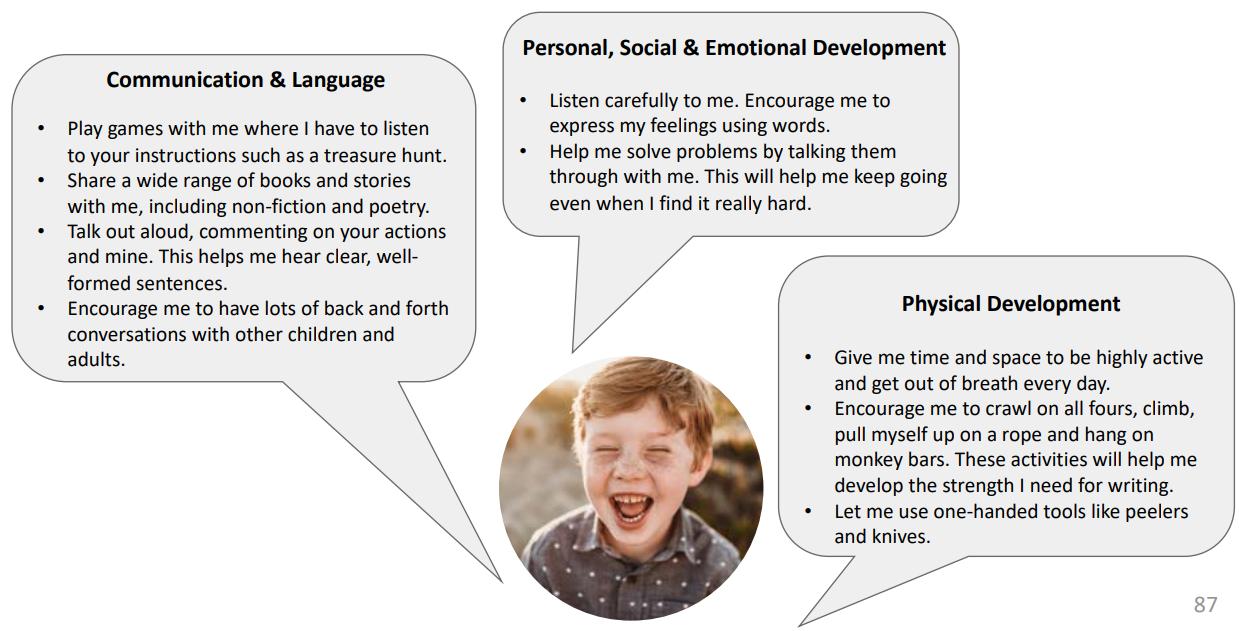 The Early Years Foundation Stage(EYFS) sets standards for the learning, development and care of your child from birth to 5 years old.