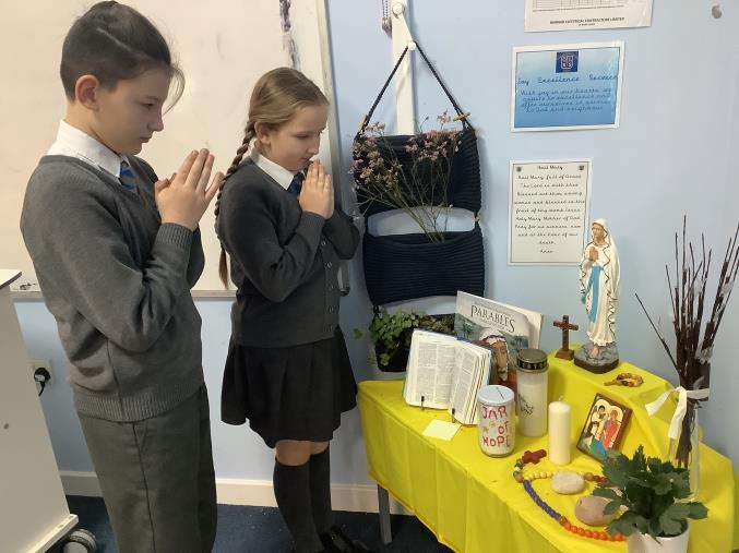 ln our RE lessons this term, the children's learning will focus on three central themes. The first of those is 'Local church', where we will be studying the Bible, considering John’s Gospel and making links between scripture and Christian beliefs. The second theme of 'Eucharist', looks at unity and how the Eucharist enables people to live in communion with Christ and each other. Finally, the topic of 'Lent and Easter' will focus on death and life and celebrate Jesus' death and resurrection. The children will learn more about the Easter Triduum.