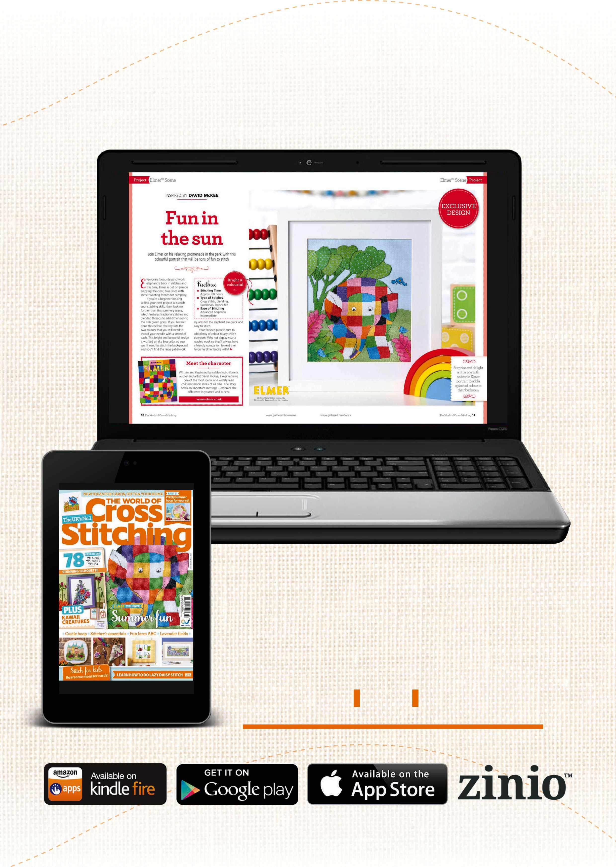 This month, we once again say a very warm welcome to Elmer the elephant (p10). With his rainbow patchwork appearance, Elmer acts as a reminder for us all to celebrate our uniqueness, and that goes for our stitching, too! Be proud of every single stitch you place, and don’t worry about it looking exactly like the photo in the magazine or like a friend’s – it’s uniquely yours!