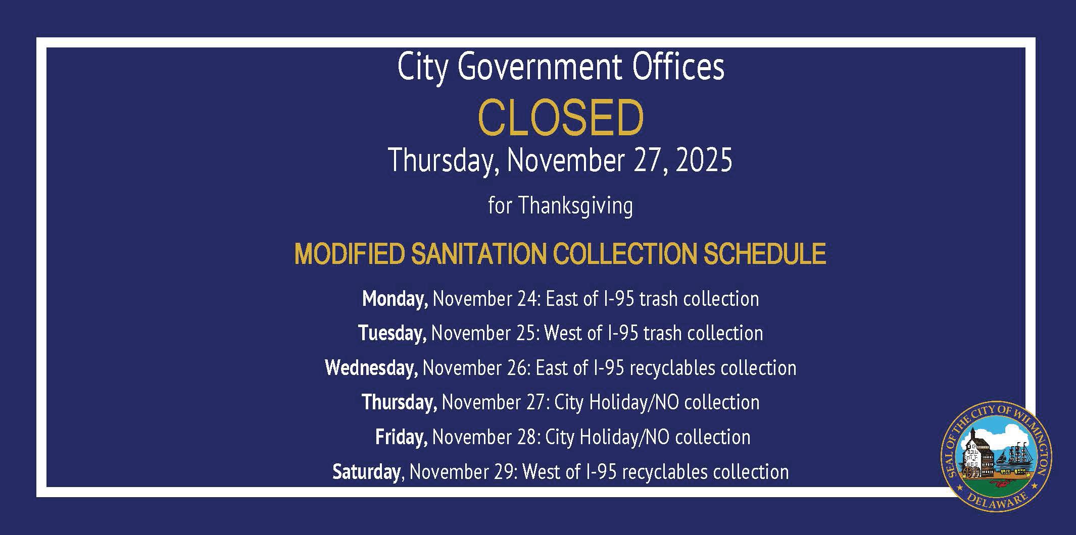 Wilmington City government offices will be closed on Nov. 27, 2025 , and Friday, Nov. 28, 2025 for Thanksgiving. As a result, the Department of Public Works’ Sanitation Division will collect trash on a modified holiday schedule: