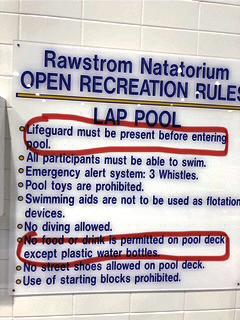 A reader who prefers anonymity questions two of the rules on the sign shown here, which she says has been on the wall of UD’s indoor pool for decades. Of the first circled rule, “Lifeguard must be present before entering pool,” she writes, “I’d like to see the lifeguard enter the pool without being present. How about: ‘Do not enter the pool unless the lifeguard is present’?” Of the second, “No food or drink is permitted on pool deck except plastic water bottles,” she comments, “I’ve never tried to consume plastic water bottles. How about: ‘No food or drink is permitted on pool deck except water in plastic bottles'?"
