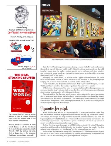 When Willetts, who worked as a psychologist for 25 years, purchased the coffee shop this past summer, he knew he personally wouldn’t be making any profit from Brewed Awakenings. He brought the shop under his nonprofit Abide Foundation, and from the beginning he has worked fulltime as a volunteer. He also immediately implemented the Community Cup, which is a pay-it-forward option—customers can donate any amount of money toward a future customer’s beverage or meal. To Ben Cordova, general manager at LOMA Coffee on Market Street in Wilmington, such above-and-beyond methods fall under the heading “passion for people.” Cordova refers to local coffee shops as a “third space” to relax between home and work. In fact, when Hockessin’s Sycamore Hill Church opened LOMA five years ago, the goal was strictly to serve a need in the community by creating a shared space. He says that’s one reason LOMA is still flourishing, with growing numbers each year.