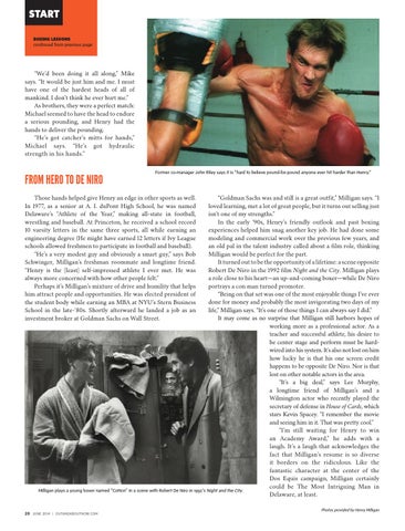 “Goldman Sachs was and still is a great outfit,” Milligan says. “I loved learning, met a lot of great people, but it turns out selling just isn’t one of my strengths.” In the early ‘90s, Henry’s friendly outlook and past boxing experiences helped him snag another key job. He had done some modeling and commercial work over the previous few years, and an old pal in the talent industry called about a film role, thinking Milligan would be perfect for the part. It turned out to be the opportunity of a lifetime: a scene opposite Robert De Niro in the 1992 film Night and the City. Milligan plays a role close to his heart—an up-and-coming boxer—while De Niro portrays a con man turned promoter. “Being on that set was one of the most enjoyable things I’ve ever done for money and probably the most invigorating two days of my life,” Milligan says. “It’s one of those things I can always say I did.” It may come as no surprise that Milligan still harbors hopes of working more as a professional actor. As a teacher and successful athlete, his desire to be center stage and perform must be hardwired into his system. It’s also not lost on him how lucky he is that his one screen credit happens to be opposite De Niro. Nor is that lost on other notable actors in the area. “It’s a big deal,” says Lee Murphy, a longtime friend of Milligan’s and a Wilmington actor who recently played the secretary of defense in House of Cards, which stars Kevin Spacey. “I remember the movie and seeing him in it. That was pretty cool.” “I’m still waiting for Henry to win an Academy Award,” he adds with a laugh. It’s a laugh that acknowledges the fact that Milligan’s resume is so diverse it borders on the ridiculous. Like the fantastic character at the center of the Dos Equis campaign, Milligan certainly could be The Most Intriguing Man in Milligan plays a young boxer named “Cotton” in a scene with Robert De Niro in 1992’s Night and the City. Delaware, at least.