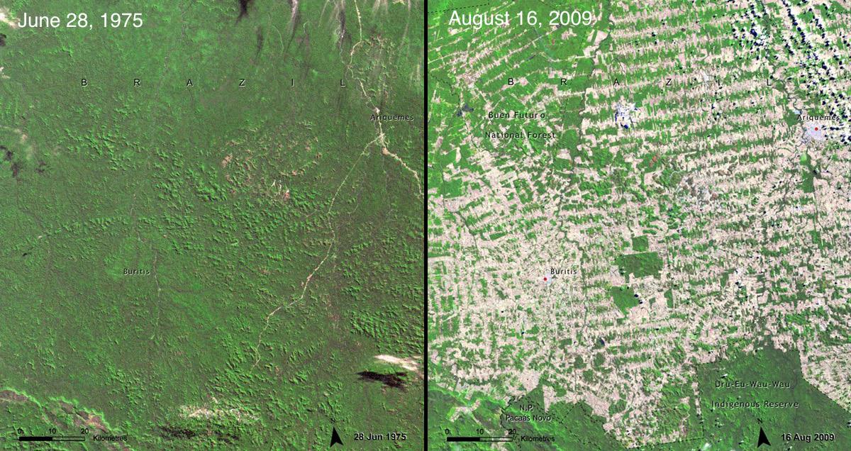 1.7 | Satellite images showing deforestation in the Amazon Rainforest (Rondônia in western Brazil) over the course of 34 years. Progression of the deforestation of nearly 52 million acres of Amazon rainforest between 1975 (left) and 2009 (right) where we see the loss of green areas. This catastrophe has been linked to an increase in the emergence of infectious diseases, such as malaria, in Brazil.
